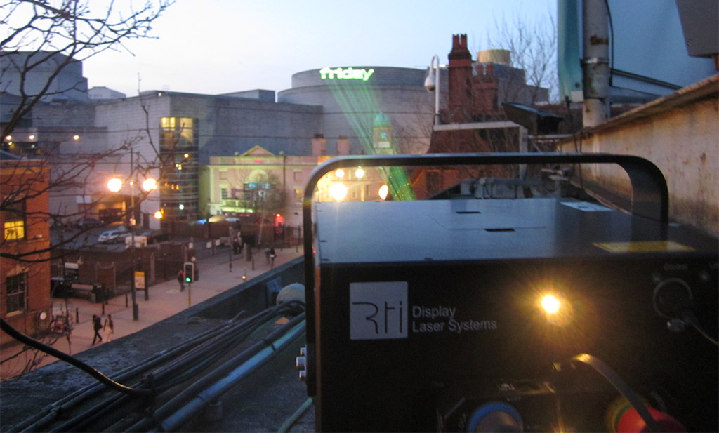 La luz láser define un rayo láser en el espectro visible (entre 400 y 700nm de longitud de onda). A menudo el término se utiliza para describir un sistema de proyección que emite rayos láser en el espectro láser visible.  El láser ("Amplificación de la luz por emisión estimulada de radiación") crea y amplifica la radiación electromagnética de una frecuencia específica a través del proceso de emisión estimulada. Los sistemas de luz láser crean haces de luz nítidos, altamente enfocados a largas distancias. Al igual que las pantallas de iluminación láser, las luces láser se utilizan como medio de entretenimiento. Las luces láser de uno o varios colores permiten efectos como imágenes y patrones animados. Se pueden producir impresionantes espectáculos de láser añadiendo más medios diferentes, como humo, niebla, proyecciones de vídeo o pantallas de agua.
